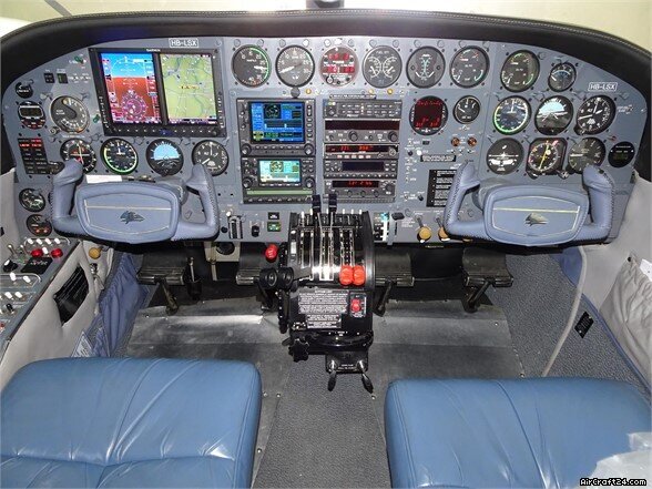 | Avionik | | Avionics and autopilot upgrade per EASA Mod. 0060029550-001 PS Engineering PMA8000C Audio Panel, Intercom, Marker Beacon Garmin GNS530W NAV-COM-GPS, interfaced with Radar System Garmin GNS430W NAV-COM-GPS Garmin G-600, EASA STC.A.S.037679 (Garmin GDU620) with TAWS and Synthetic Vision, Radar Display King KI206 Number Two NAV Indicator King KX165A NAV-COM 3, 8.33 kHz S-TEC 55X Autopilot with Computerl, Transducer, Roll/Pitch/Trim Servos, Turn and Bank, Yaw Damper, FAA STC SA8890SW-D, LBA Validated Shadin Digidata-L with Fuel Flow Option grandfathered FAA STC SA00729SE-D King KN63 DME, displayed on Garmin G600 King KR87 ADF displayed on Garmin G600 Garmin GTX330 XPDR S Number 1 Garmin GDC74A Encoder King KT73 XPDR S Number 2 ACK A30.4 Encoder Garmin GWX68 Weather Radar displayed on Garmin G600 King KRA10A Radar Altimeter Altitude Alerter integrated in the Garmin G600 L-3 Sky 497 TAS System displayed on Garmin G600 and GArmin GNS530W, connected to ACK A-30.4 Encoder Artex ELT ME406, PN 453-6603, 406 Mhz Intercom for all Occupants EDM760 Engine Analyzer Astro Tec Digital Clock/Timer Complete Co-Pilot Instrument Panel ASR EPU6A5 Emergency Power Supply Attitude Gyro, Attitude Indiator, Vertical Speed Indicator, both Airspeed Indicators, Fuel Quantity Indicator, Manifold Pressure Indicator repaired by Avionitec on 20.09.2013 Main Battery replaced on 20.09.2013 Both Attitude Indicators and Tachometers repaired by Avionitec on 30.03.2015 Radar Antenna GWX68 replaced on 02.11.2016 HSI replaced on 14.12.2018 |