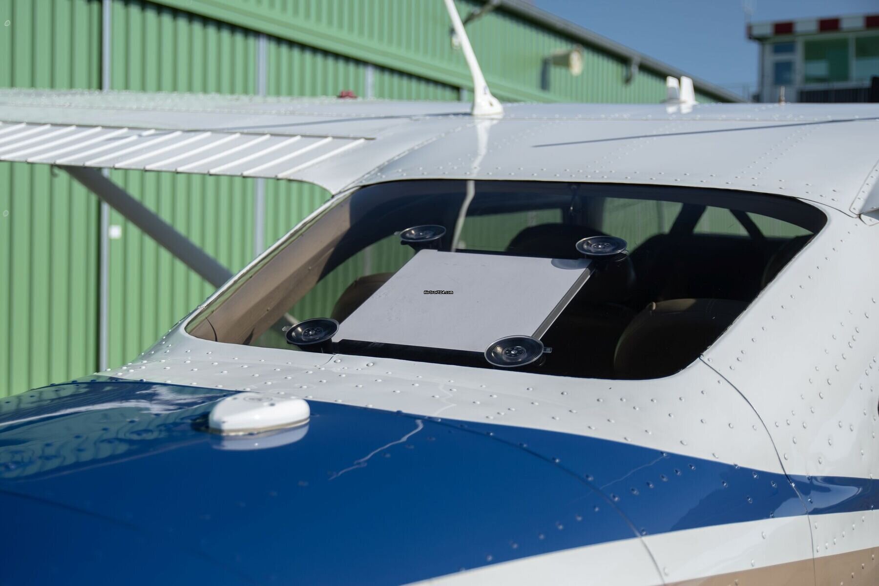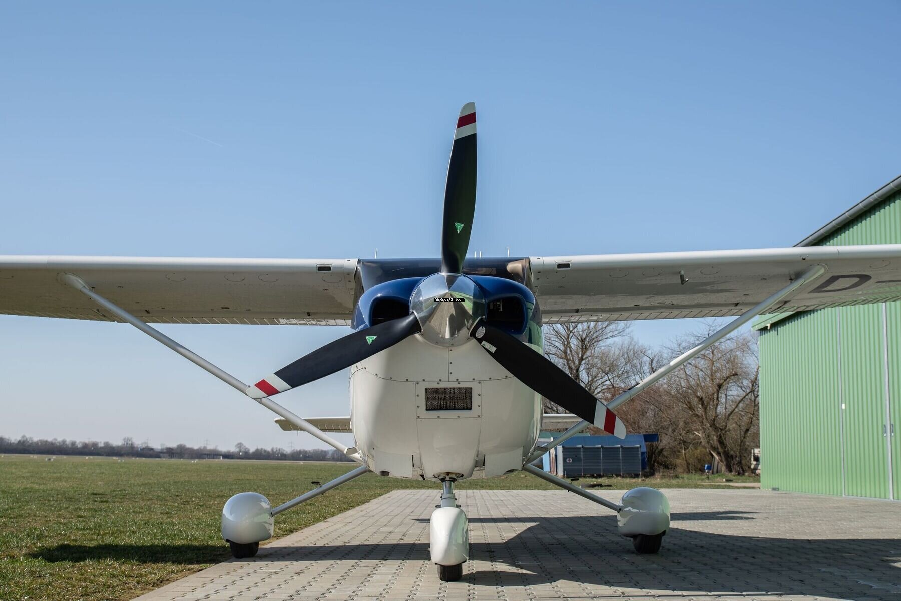 | Exterieur | | Presenting an impressive ramp presence, this 182T Skylane boasts a crisp white, and blue paint scheme with refined black and bronze detailing. The sweeping accents follow the aerodynamic lines of the fuselage, leading the eye to the high-performance polished McCauley propeller. With its clear glass and matching wheel fairings, this aircraft offers a cohesive and premium appearance that stands out on any flight line. |